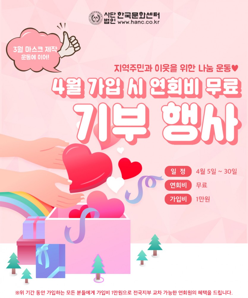 이에 한국문화센터도 지역주민과 이웃을 위해 "3월 마스크제작 및 마스크나눔 운동"에 이어 "4월 년회비무료 기부행사"를 진행하게 되었습니다.