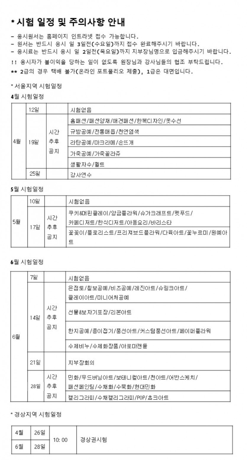 한국문화센터 연합회 2025년 4월, 5월, 6월 서울/경상 시험일정안내 페이지 정보 작성자 hanc 작성일25-01-09 12:49 조회20,077회 댓글0건 이전글 다음글 목록 본문 시험 댓글목록 등록된 댓글이 없습니다. 이전글 다음글 목록